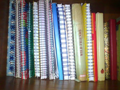Só em 2010, quando comecer a pensar seriamente em escrever algo publicável, é que adotei, definitivamente os cadernos. Prática que mantenho ainda hoje. Geralmente, são cadernos A5, que podem ser levados para todo o lado na minha mala. Muitas vezes, são oferecidos aos meus pais, em congressos, outras vezes são sobras de material escolar, minhas ou dos meus irmãos, outras vezes sou eu que os compro. Se puder escolher, prefiro argolas e folhas quadriculadas. Por possuírem mais linhas - e a minha letra, ainda por cima, é grande - e por darem jeito para fazer esquemas. Como poderão ver nesta fotografia, e no topo do blogue, gosto de guardá-los e exibi-los. Em parte por vaidade, para poder olhar para eles e pensar: "A minha "obra" está toda ali". Também gosto de folhear os cadernos, ver os rascunhos de certos capítulos ao lado de notas ou rascunhos de entradas para os meus dois blogues, para me recordar das circunstâncias em que escrevi aquelas passagens (jogos da Seleção, episódios de séries que acompanhava, músicas recém-lançadas...). Mas sobretudo por conterem imensas notas para as sequelas de "O Sobrevivente".