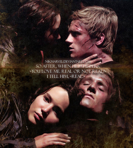 Nisto surge Katniss, toda a gente sabe como. Uma jovem endurecida pelas dificuldades por que passou, em particular após a morte do pai e consequente depressão da mãe. Surge também Peeta, filho do padeiro, que ajudara Katniss anteriormente, num momento em que todas as portas se haviam fechado para a jovem. Enquanto Peeta se revela mais ingénuo, Katniss é mais cínica, sempre se questionando sobre as verdadeiras intenções do jovem padeiro, sem perceber que ele está a ser sincero, que os seus sentimentos são verdadeiros. Nos dois primeiros livros, aliás - pelo menos, da primeira vez que os li - Peeta não me é uma personagem mais apelativa: demasiado submisso e, muitas vezes, representando um fardo para Katniss na arena. Só no fim do terceiro livro é que compreendi verdadeiramente a personagem - mas já aí vamos.